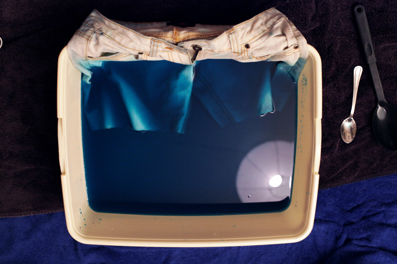 After rinsing them, I soaked them in the soda ash solution for 20 minutes. Somehow, after they soaked in the soda ash, a brown mark appeared. I’m fraying that area but I will have to figure out why that happened. 🙁 Wah. So then, I mixed the dye and water. I dipped most of the jean into the mixture and let it sit for ten minutes before dragging it up slowly and stirring the dye. I repeated this until I had dyed most of the jean.